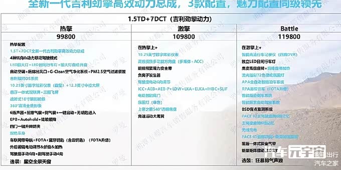 新车共推出3款车型,基础热擎版采用双色车身,配备18英寸战斧式轮毂,搭载4种转向和动力联动驾驶模式。智驾方面匹配吉利星河OS系统,提供360°全景影像、车联网导航+FOTA+蓝牙识别无钥匙进入等功能。