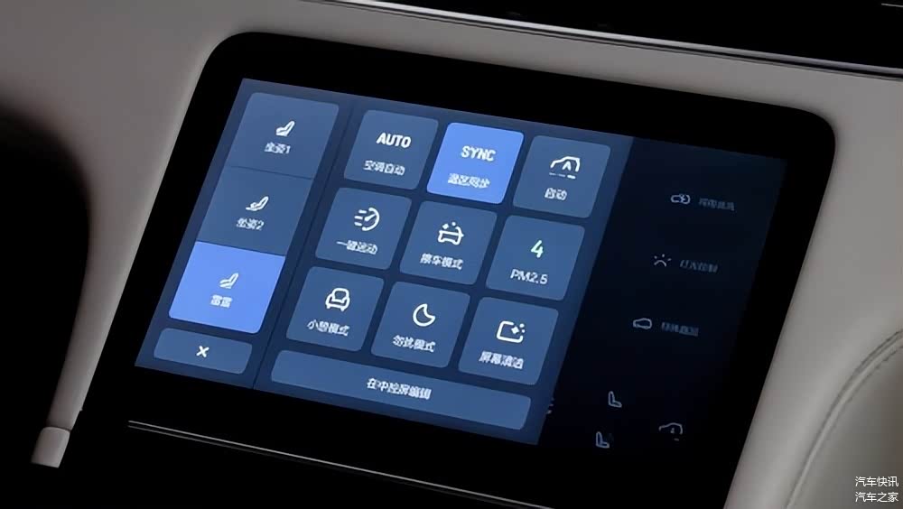 在功能控制屏快捷面板中,还有一个“SYNC温区同步”的按键,这是让主驾可以同步调整车内三个温区温度的功能。