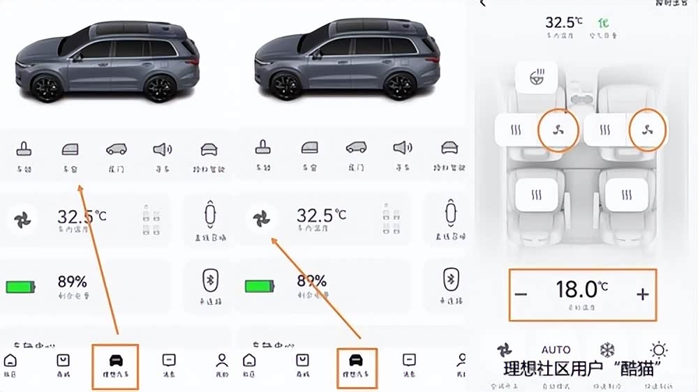 办法二:开空调。打开理想App——点击底部中间按钮“理想汽车”——点击车内温度左边的空调按钮。当然,不仅可以开空调,还能设置空调温度,打开前排座椅通风等。或者,干脆直接打开空调快速制冷模式。