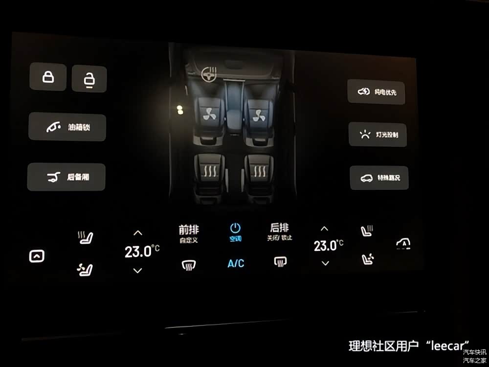 在理想ONE的功能控制屏上,空调开关的正下方就是“A/C”按钮。A/C字面上也是空调的意思。需要制冷时:按下空调键调整好温度,自动联动A/C开启,车内开始降温。需要关窗通风时:按下空调键,关闭A/C,这时吹进车内的是自然风。