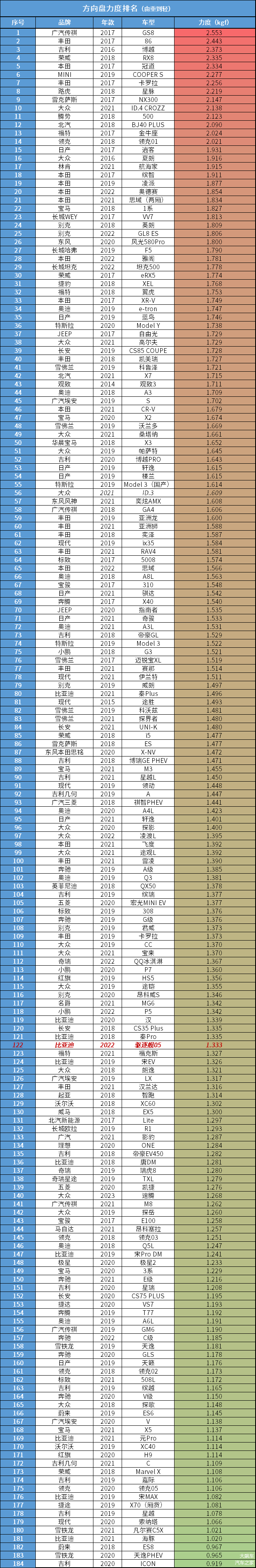 我们在同一路段(地面摩擦力相同),胎压调至厂家标准胎压,使用标准模式,用拉力计原地匀速旋转方向盘90度,取最大数值。