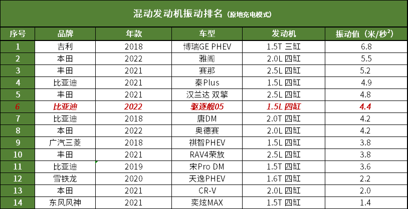 这辆驱逐舰05混动搭载了一台1.5升自吸四缸发动机,怠速振动数值为4.4米/秒²,属于振动较大的一类。