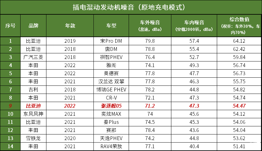 测试方法:发动机完全热机,水温正常,关闭空调,正常怠速下进行测试;打开发动机盖、取下引擎罩,在距离发动机机体上方20厘米处,进行噪音采集,取平均值,为车外发动机噪音数值(dBa);在车内,将车窗关闭,发动机空载运转2000转/分,将噪音仪置于方向盘正上方,取平均值,为车内发动机噪音(dBa)数值。并且以车内30%,车外70%的权重进行综合计算。