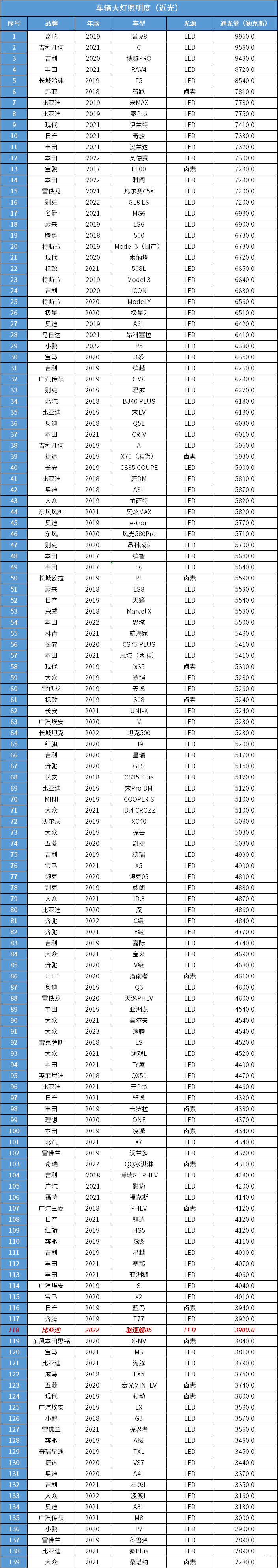 这辆车的大灯是LED光源,最大光照度为3900勒克斯,不算很亮。