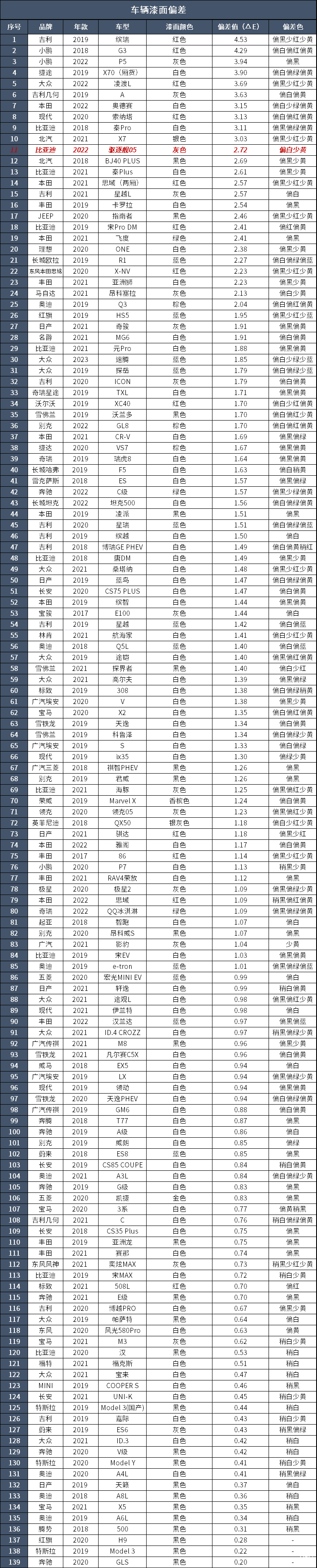 经过测试,最大色差值位于后保险杠处,色差值为2.72ΔE,比基准点偏白少黄。从数值上来看,这辆车的喷漆工艺质量控制得一般。