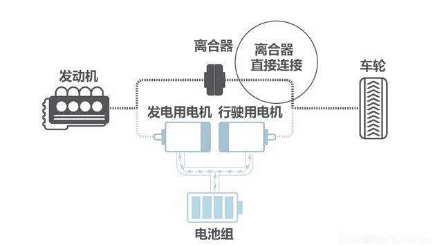 3.高速巡航模式,发动机直接连接离合器将动力传输到车轮,驱动车辆前行,并且通过发动机为电池组充电。随着电池剩余电量增加,切换为EV模式行驶,以此循环往复。