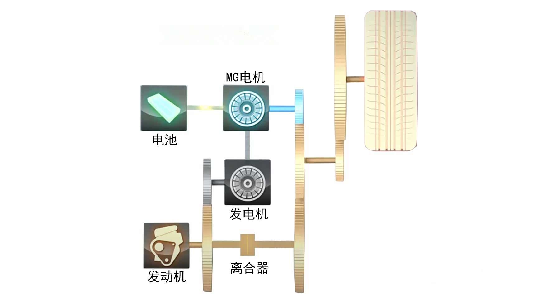 3.发动机直连式离合器。在高速巡航期间,发动机输出轴直接连接车轮,进入发动机直驱模式,此模式相当于手动变速箱的最高档,这样发动机同样可以运行在高效率区间。