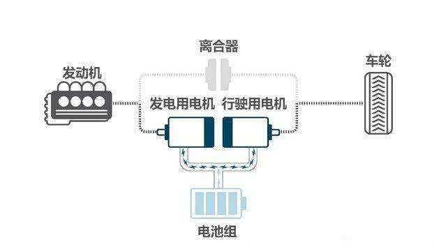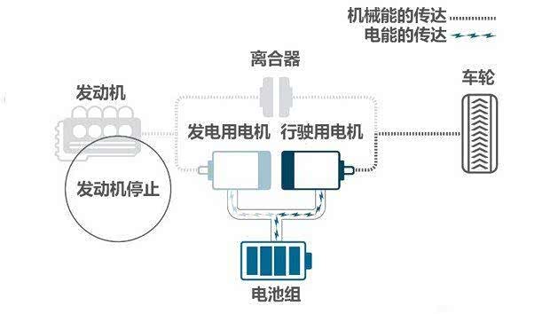 2.混合动力驱动模式。在电池电量不足或者需要加速请求时,发动机启动,转速被维持在能发挥最高热效率的转速区间,由发动机驱动发电用电机,将产生的电力供应给行驶用电机,驱动车辆前行。(根据实际情况,需要为电池充电或由电池提供助力)