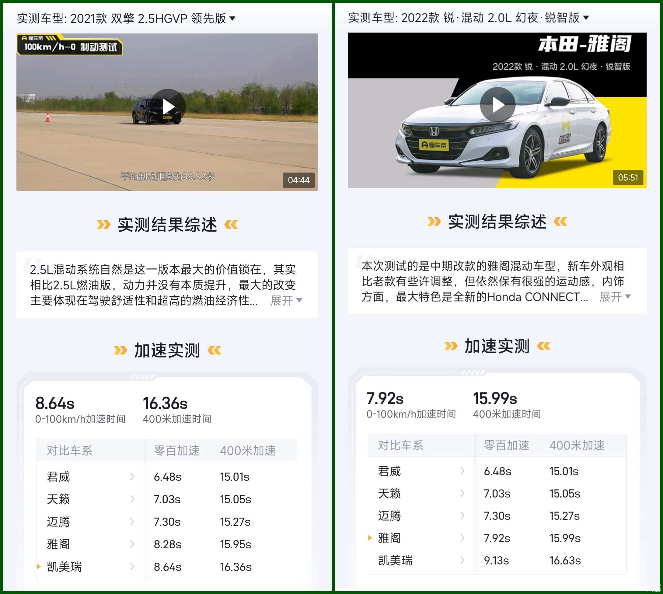 由于自主品牌没有非插电式的中级轿车,所以不是非常好比较,但参考拿铁DHT(非插电)和CR-V混动(雅阁同款i-MMD混动系统)的油耗成绩来看,CR-V的i-MMD混动系统的油耗还是更胜一筹,大约百公里领先0.8L左右,两者的实测加速性能接近。