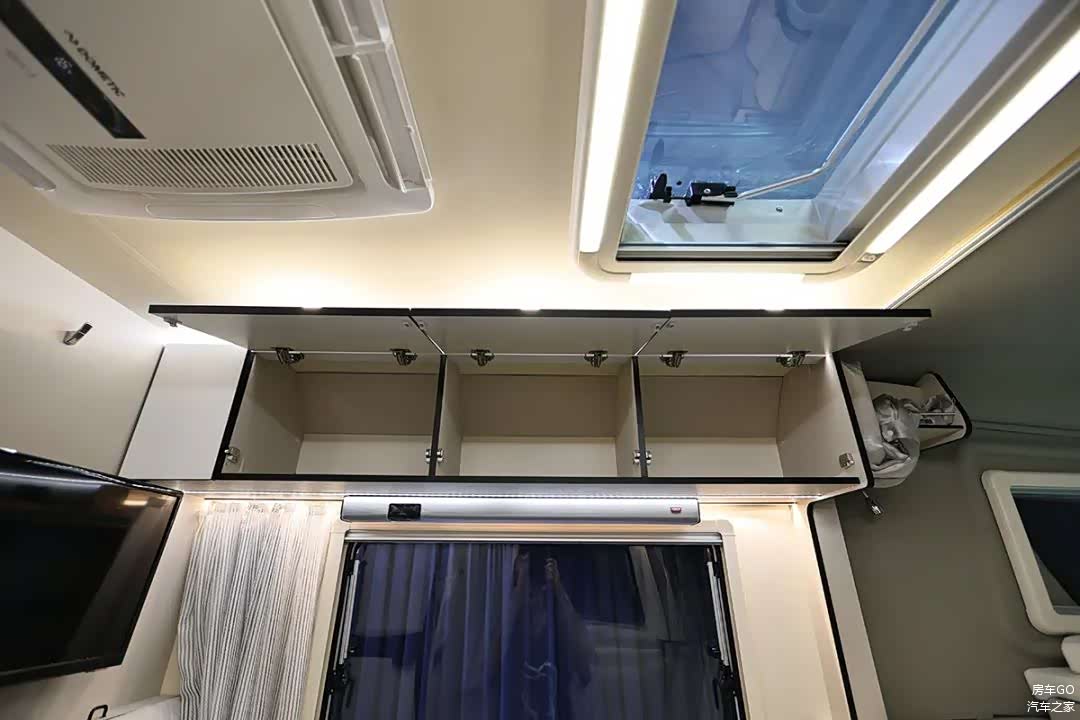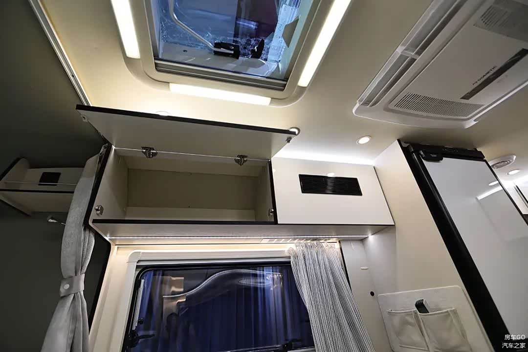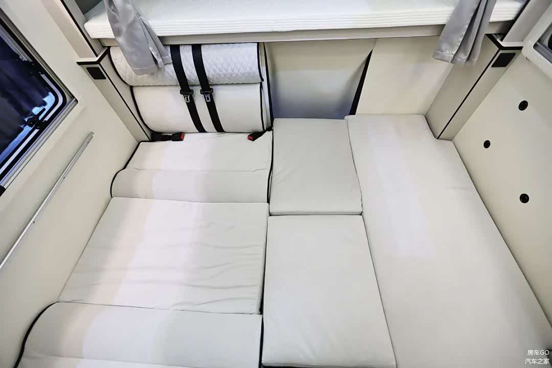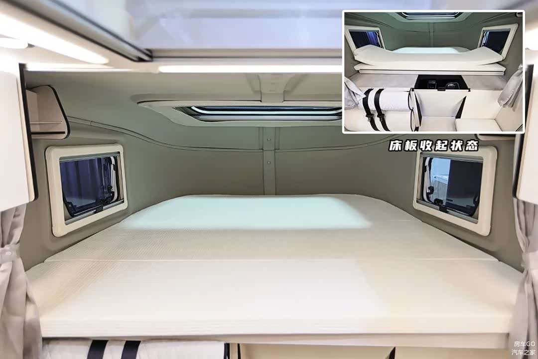 位于驾驶室正上方的主卧大床,尺寸达到了1.976×1.7(米),这个宽度在房车上称为“3人床位”也不过分,床位内高实测72厘米。主卧三面环床,均可打开换气,床板还采用了可收起的推拉式结构。