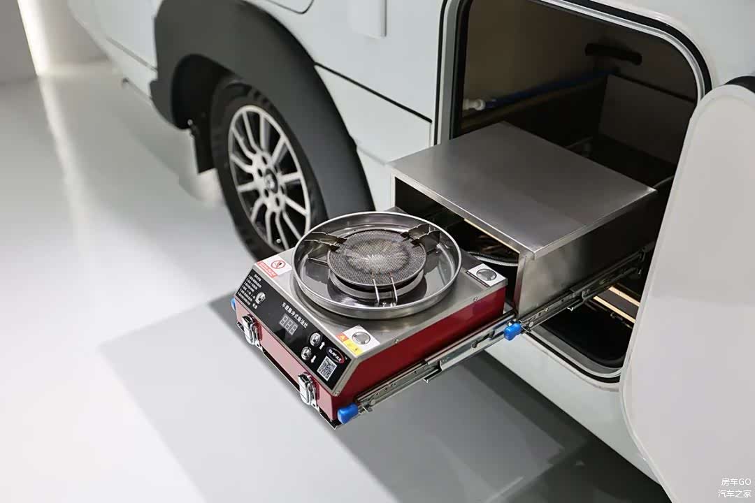 车外厨房配套了柴油灶、折叠桌板及快接取水口。