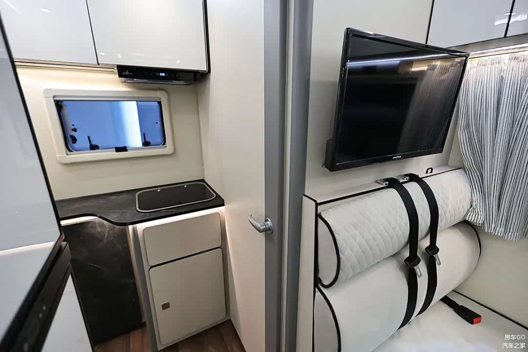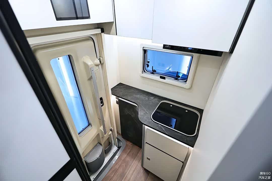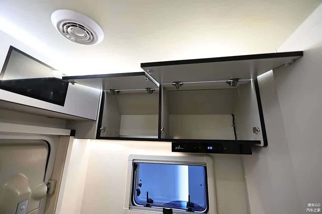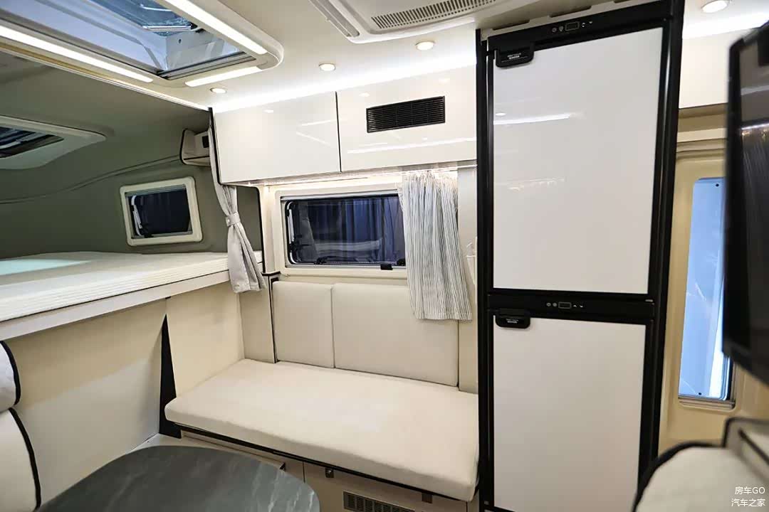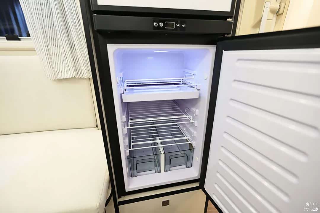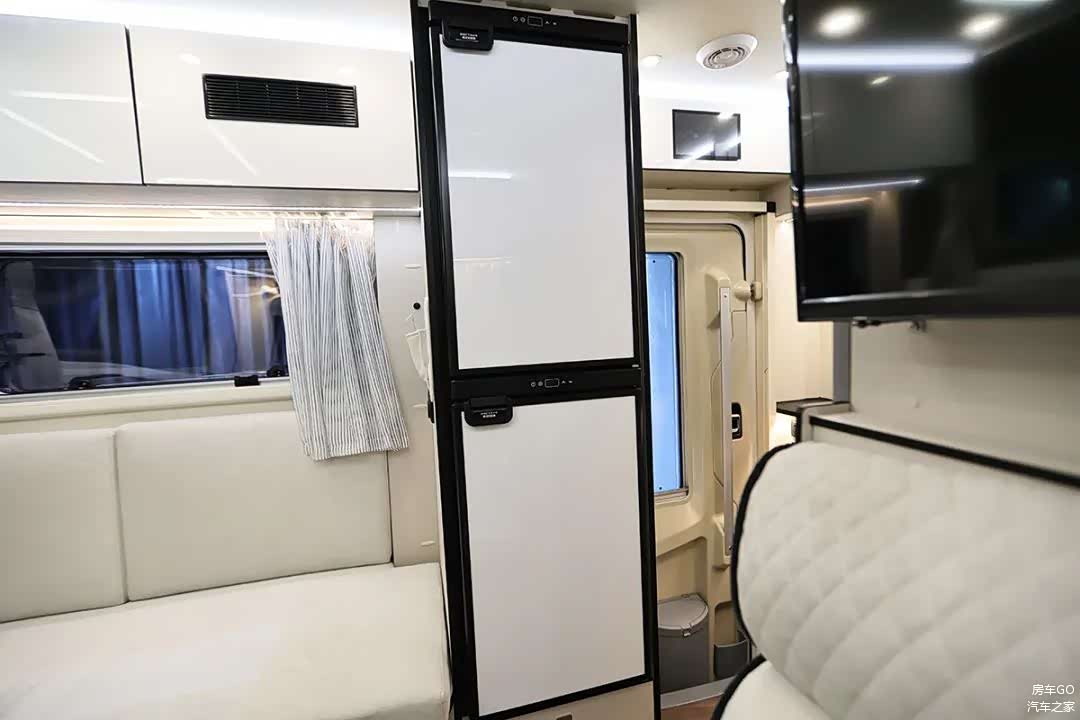 车内配备了2台英德尔76升房车冰箱,柜门配有锁扣。2台独立冰箱可分别设置制冷强度,总容积达到152升。而冰箱恰好布置在上车处,还能起到一个保护隐私的隔断效果。