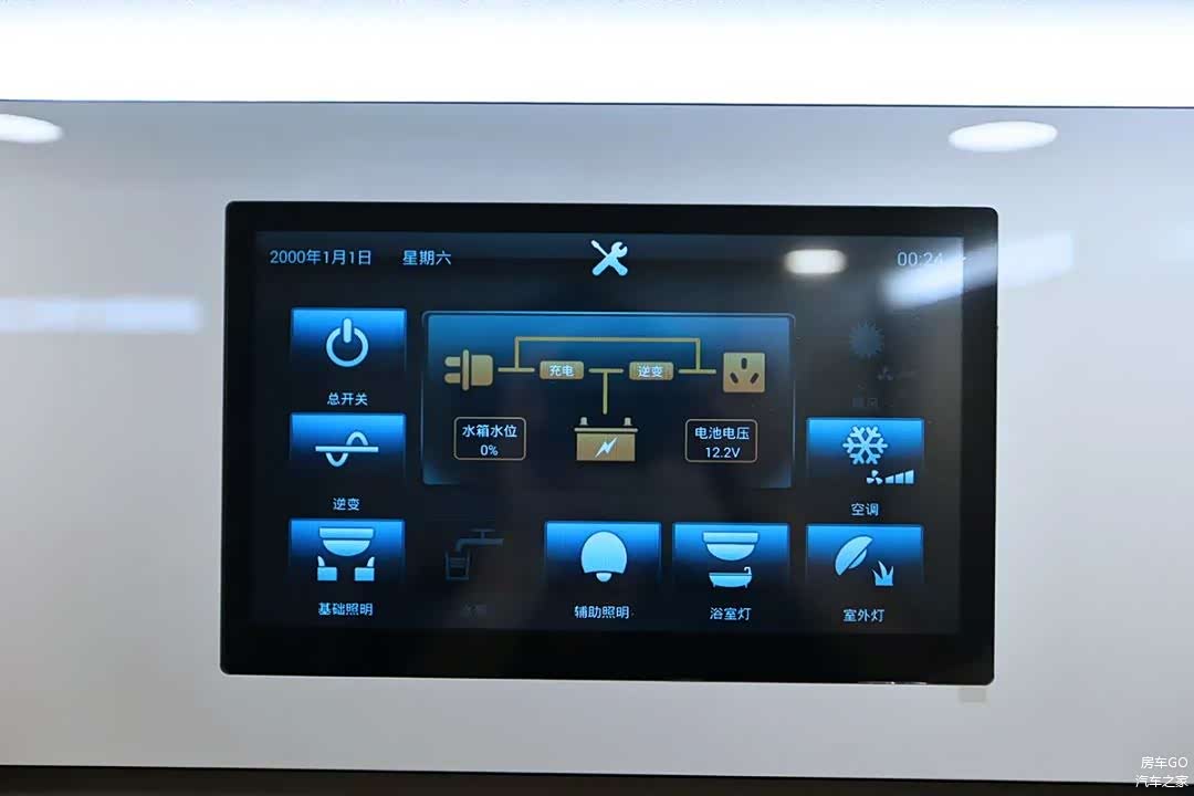 览众房车的控制系统比较简洁直观,水电状态和开关区集成在一个界面内,屏幕后方也隐藏了实体开关。