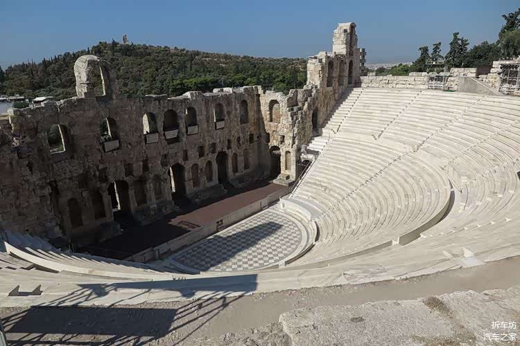 接近卫城入口时,坡下出现一座剧场——阿迪库斯音乐厅,建于罗马时代,能容纳6000多人,至今仍在用。其中最著名的,是雅尼的雅典卫城音乐会,那是1993年的事儿,网上有不少文章说是在帕特农神庙,其实是在这座剧场里。
