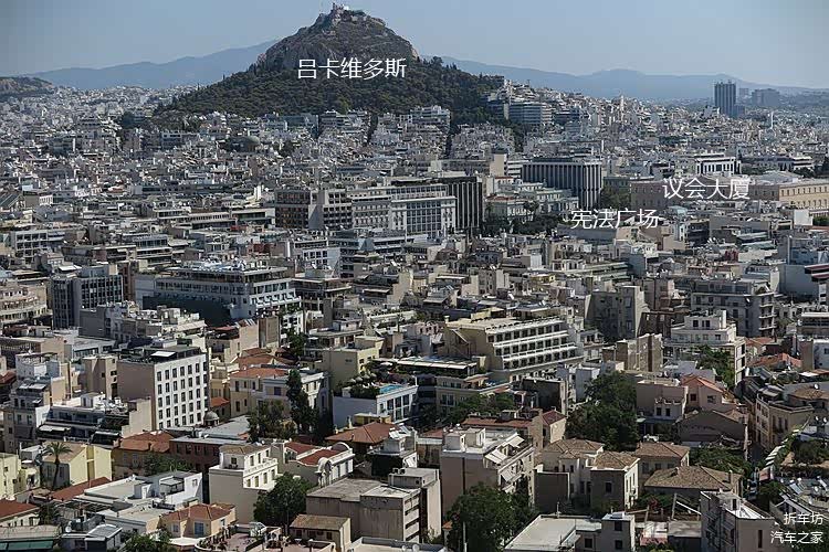 这条小街一直在上升,不知不觉,已经走到高处。刚到雅典那天参观的宪法广场、议会大厦,以及昨晚看落日的吕卡维多斯山,一览无余。