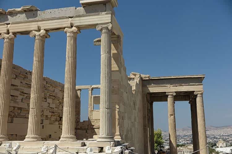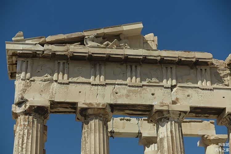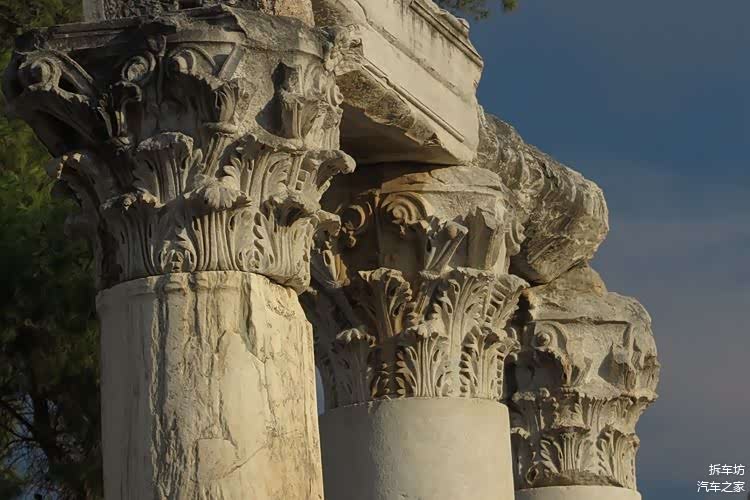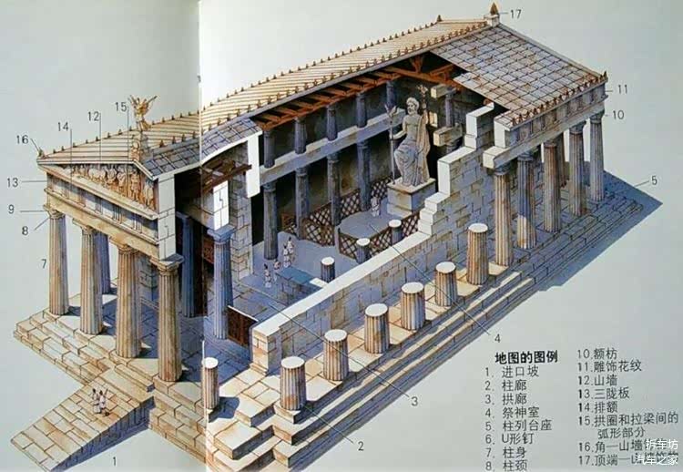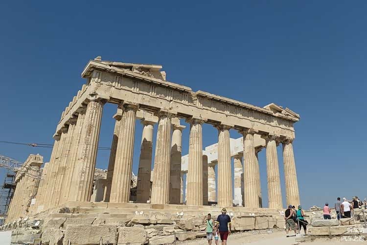 如果您仔细看,会发现上图与下图中的柱子造型,并不一样。上图中的柱子,比较粗壮,柱身有一道道竖纹,顶部造型淳朴而厚重。在雅典看到的宙斯神庙、帕特农神庙,都是这种形式,它叫多立克柱式。