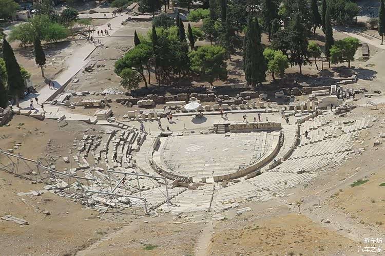 走到平台的尽头处,东南方向大概500米,是刚到雅典那天所参观的哈德良拱门与奥林匹亚宙斯神庙,此时我发现,这个方向的脚下,还有座剧场,查看地图得知,它叫狄俄倪索斯剧场。我第一次知道它,是在余秋雨的《千年一叹》中,书里说:这个剧场建于公元前6世纪,最开始上演祭神歌舞,随后又产生了戏剧,也就是说,它是戏剧诞生的第一个剧场。