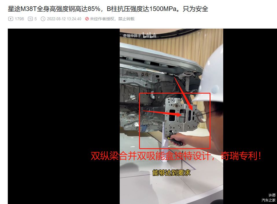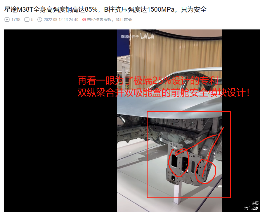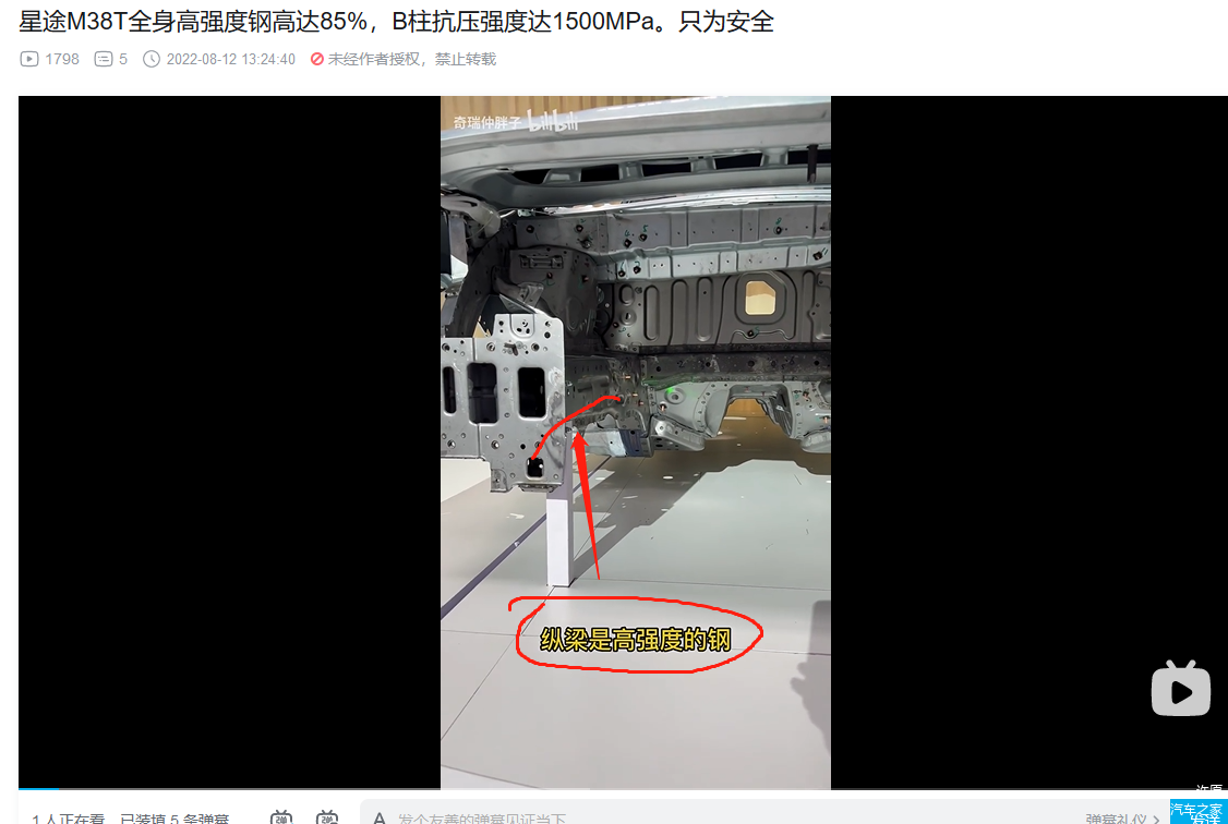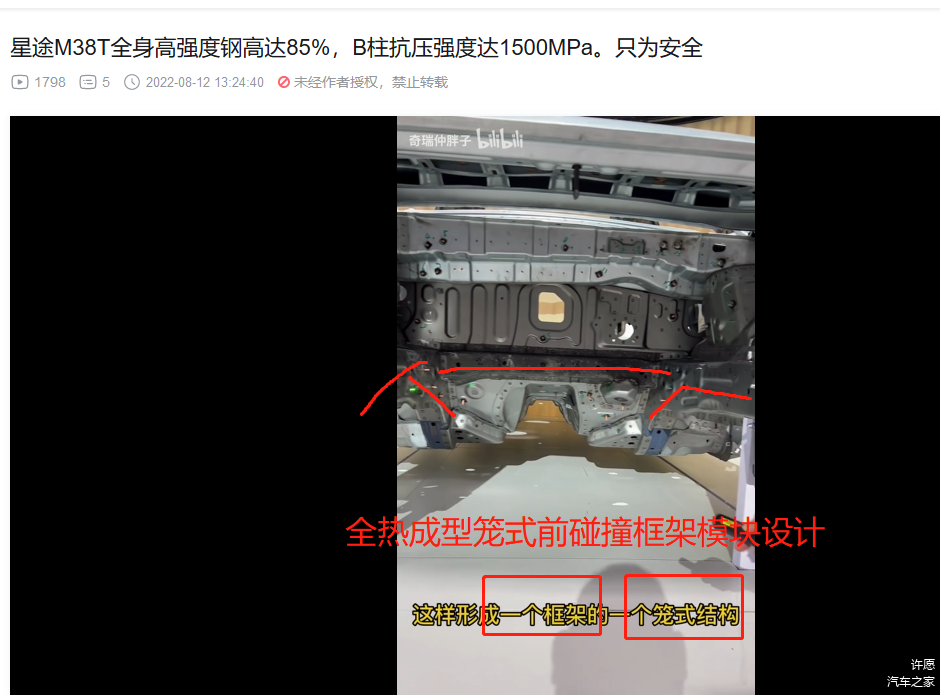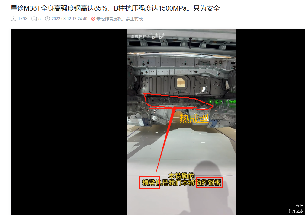 3. 前机舱和驾驶位车体核心部分的横梁,热成型!(视频里面说本特勒,没直接说热成型,不过看颜色,那显然是热成型,而且M38T和艾瑞泽8的官方解剖图也都标注了,视频部分偷懒而已)。