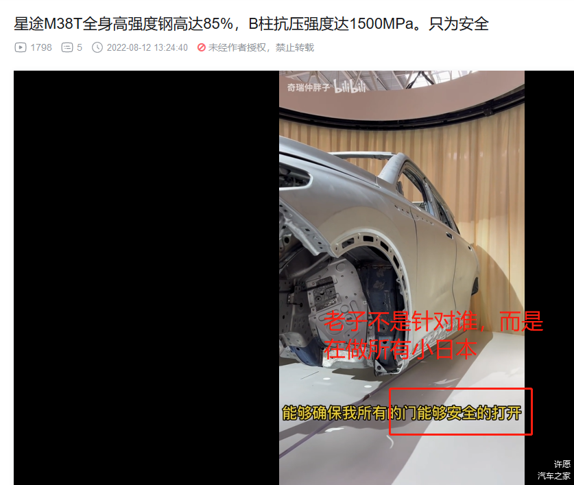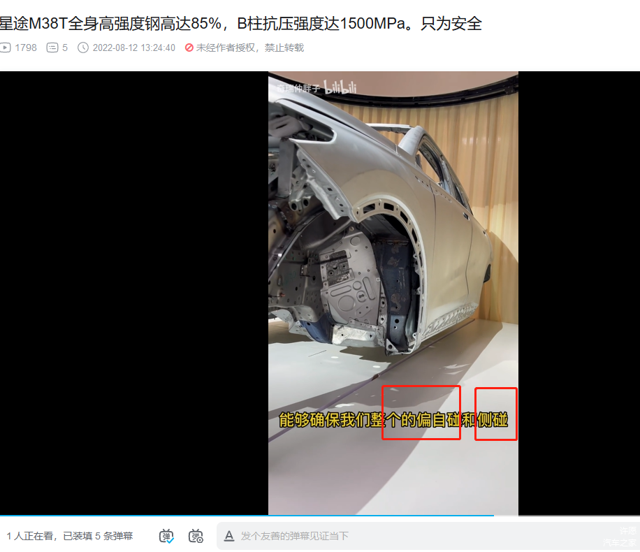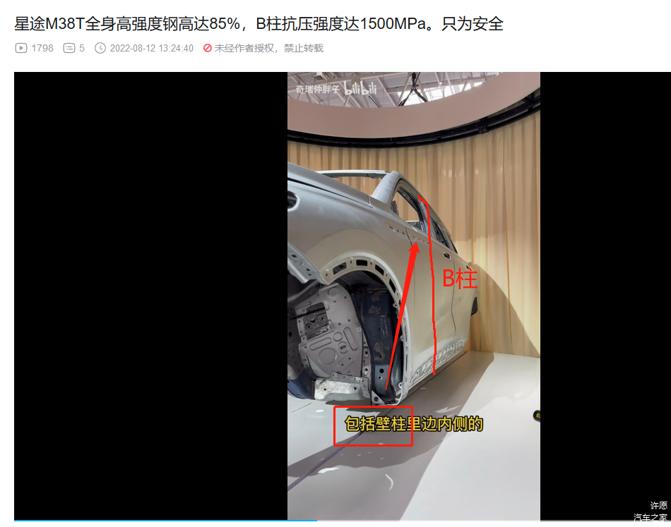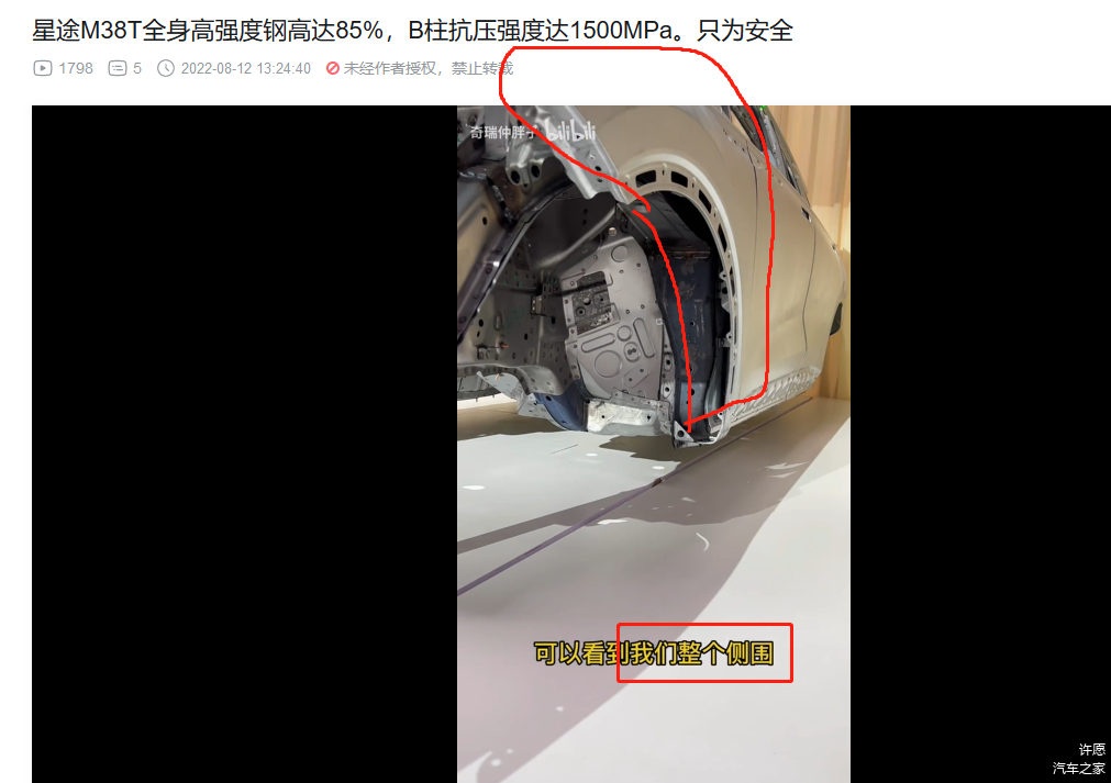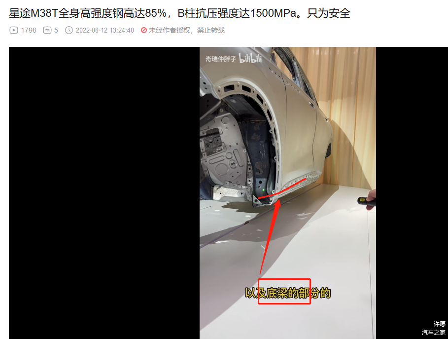 3. 前机舱和驾驶位车体核心部分的横梁,热成型!(视频里面说本特勒,没直接说热成型,不过看颜色,那显然是热成型,而且M38T和艾瑞泽8的官方解剖图也都标注了,视频部分偷懒而已)。