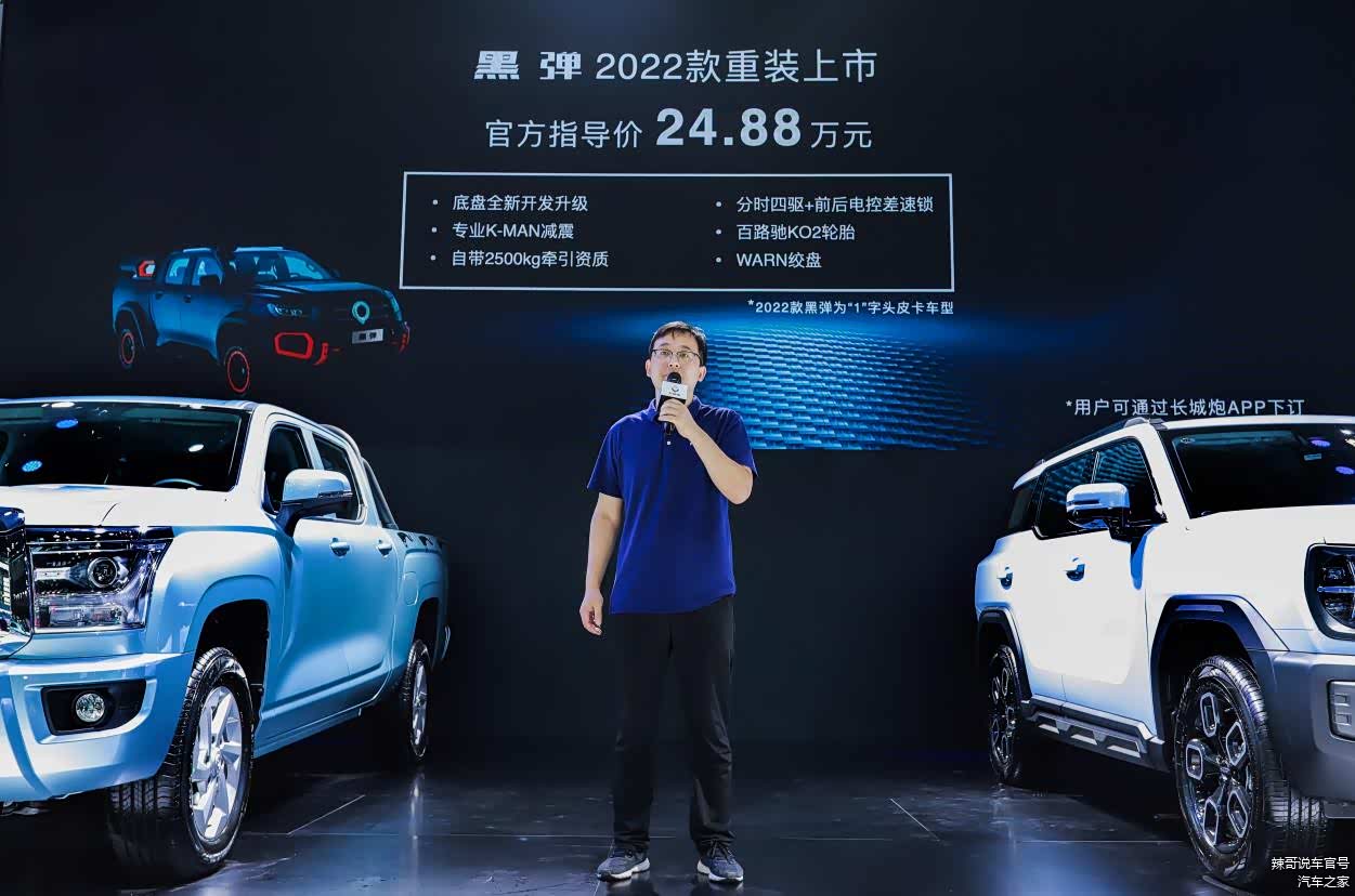8月17日,是2022年中国·银川国际汽车博览会的第一天,同日, 长城炮(图片 | 参数 | 询价)2022款黑弹、越野炮拖挂版、金刚炮平底货箱版3款车型亮相现场,其中2022款黑弹属于全新车型,官方指导价为24.88万元。