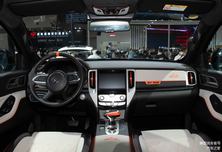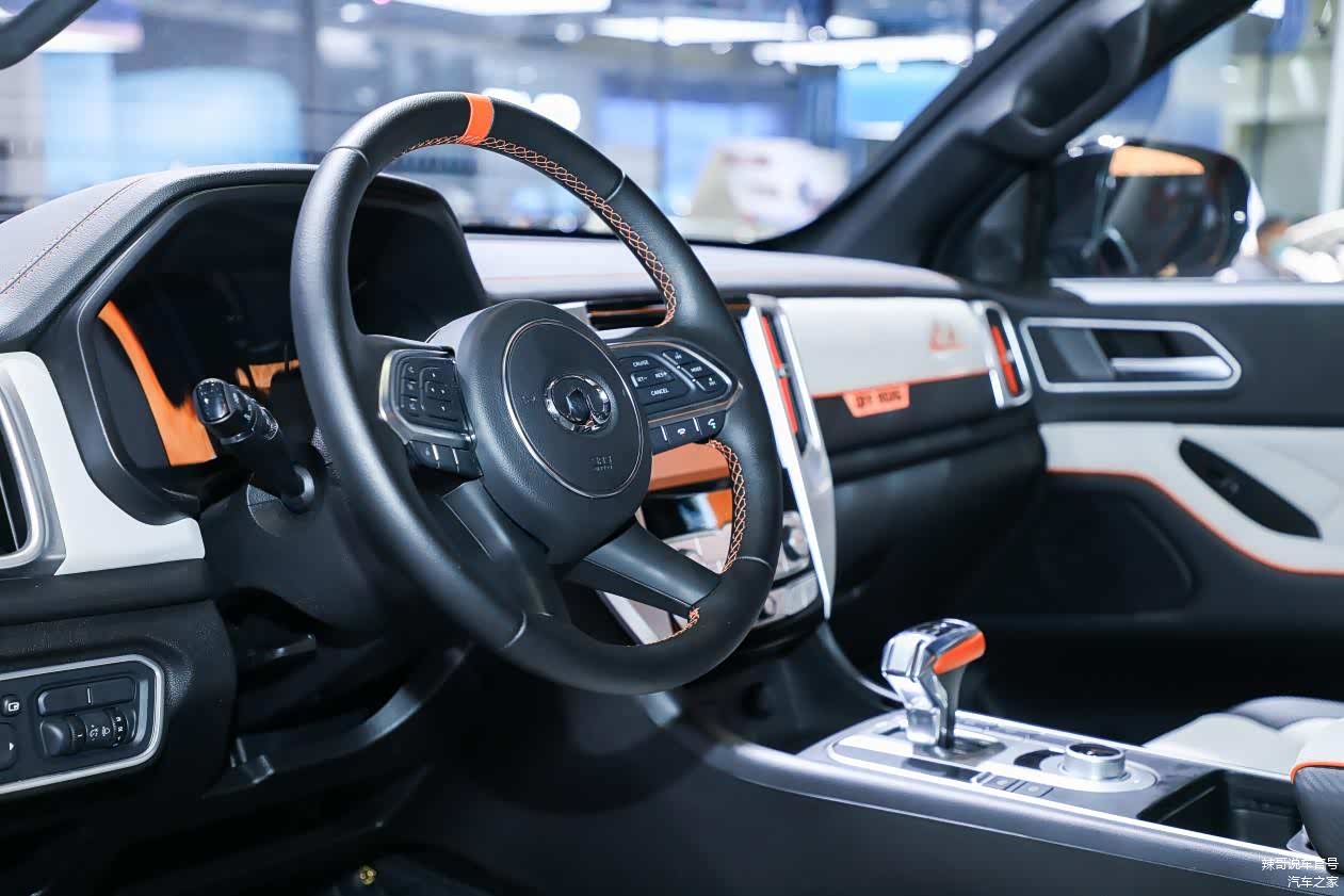 长城炮黑弹版的内饰比较简洁,中控台、座椅、车门饰板都采用了双色拼接,出风口、档杆、方向盘、座椅缝线上也加入了亮橙色的配色,在大气的整体氛围中有了几分活泼的味道,弱化了方正造型带来的呆板感。