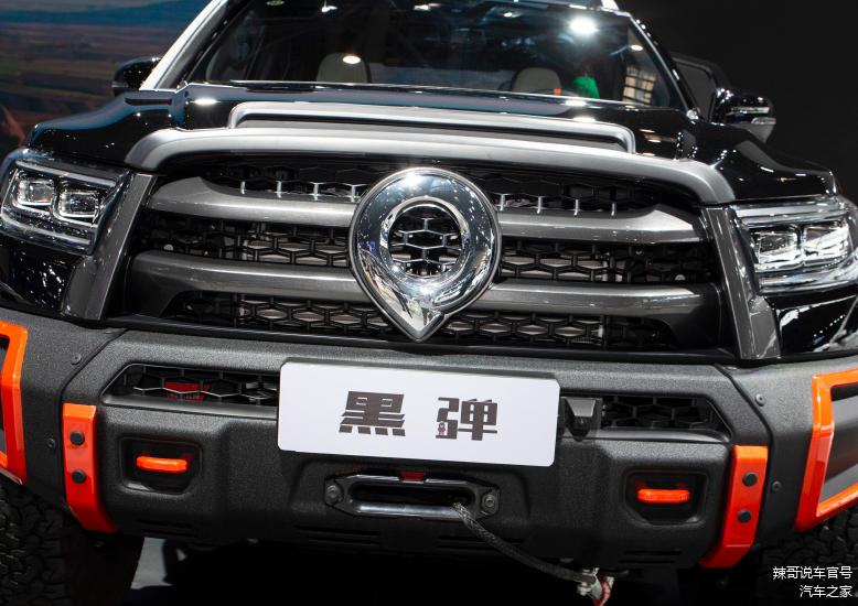 长城炮黑弹整车采用了黑色车漆,强调了“黑弹”的车型命名。在保险杠、轮毂等细节处,又加入了粗壮的亮橙色饰条进行点缀,黑橙相间的配色,中网处加入了两条贯穿式的横幅,并且和车标组成了一个整体,内部则采用了网状设计,层次感设计得很到位。