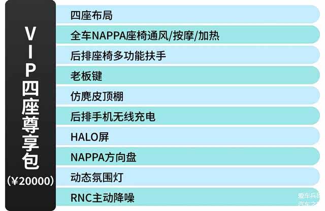 四座尊享包的主要升级点都在后排,座椅通风/加热/按摩和多功能扶手是比较实用的舒适性功能,并且这个选装包还包含了仿麂皮顶棚、老板键和HALO屏等功能性配置,适合商务出行,以及经常开车载人的消费者。但如果你的车经常坐5个人,或者是你自己经常开的话,这个选装包的实用性反而稍差一些。