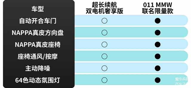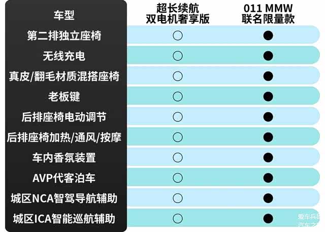 高配和限量版之间的差距,主要在于后排两个独立座椅、无线充电功能、真皮/翻毛材质混搭座椅、老板键、后排座椅电动调节、后排座椅加热通风按摩、车内香氛装置,以及AVP代客泊车和HALO屏等功能配置,基本算是把高配车型的选装包给全加进来了。