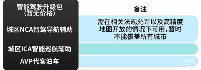 智能驾驶升级包主要包含了城区内的智能驾驶辅助,如果经常在城市道路开,并且会经常遇到堵车的话,这个选装包就比较适合你了,但需要注意的是,目前NCA智驾导航辅助仅适用于部分城市,并且需要在法规允许和高精度地图开放的情况下才可以使用,并且这个选装包的价格尚未公布,有需要的小伙伴可以再等等。