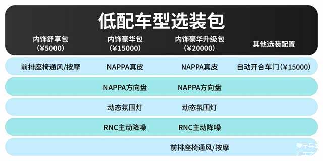 兵哥想说如果需要就选装,但请量力而行,强烈不建议将低配专享的选装包堆满,假如你要堆满的话,低配车价34.99万元+20000元(内饰豪华升级包)+15000(自动开合车门),总价来到了38.49万元,比中配的车价还要贵,差价来到1.5万元,如果你真的想堆满配置,不如直接一步到位上中配,还能便宜一些。