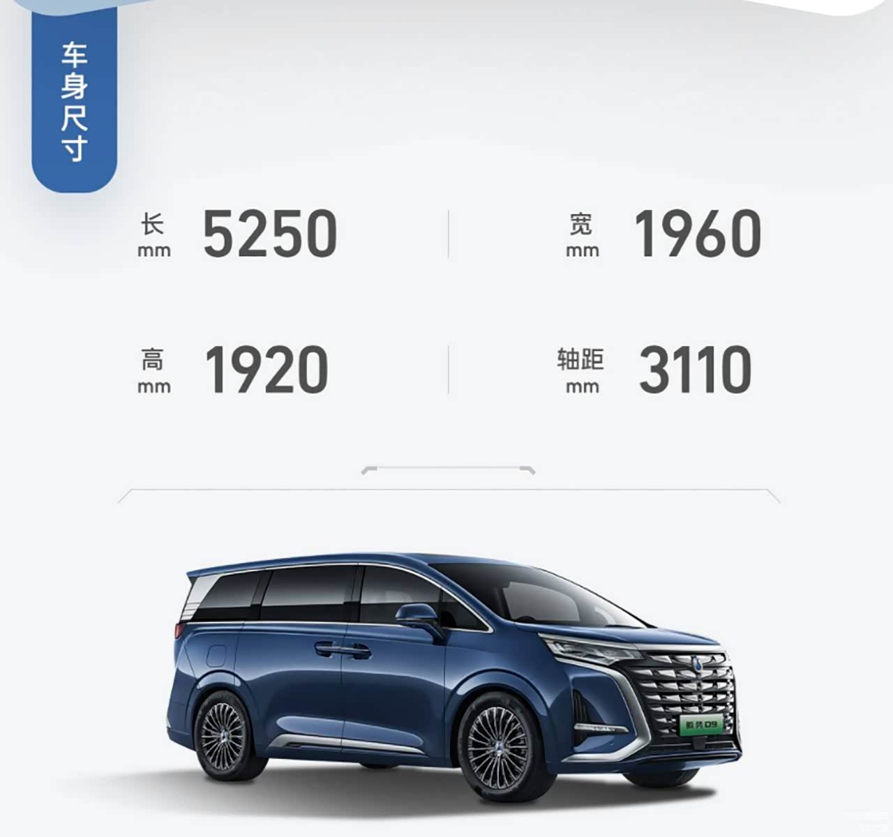 外观方面,腾势D9采用了π-Motion势能美学设计语言,铠甲格栅辨识度相当高,再加上整车强大的气场有着不一般的视觉冲击感,而EV版本则采用了竖向直瀑中网辨识度依旧很高。提供晨光金、晌雅蓝、皓日白、苍霁灰、凝夜黑五种车身配色。尺寸方面,腾势D9的长宽高为5250*1960*1820mm,轴距为3110mm,这个尺寸在同级别中优势明显。内饰方面,腾势D9采用了比亚迪风格的设计语言,但是后排的配置以及舒适程度相当不错,甚至全系标配了丹拿音响。动力方面,腾势D9搭载比亚迪DM-i混动以及三电系统。