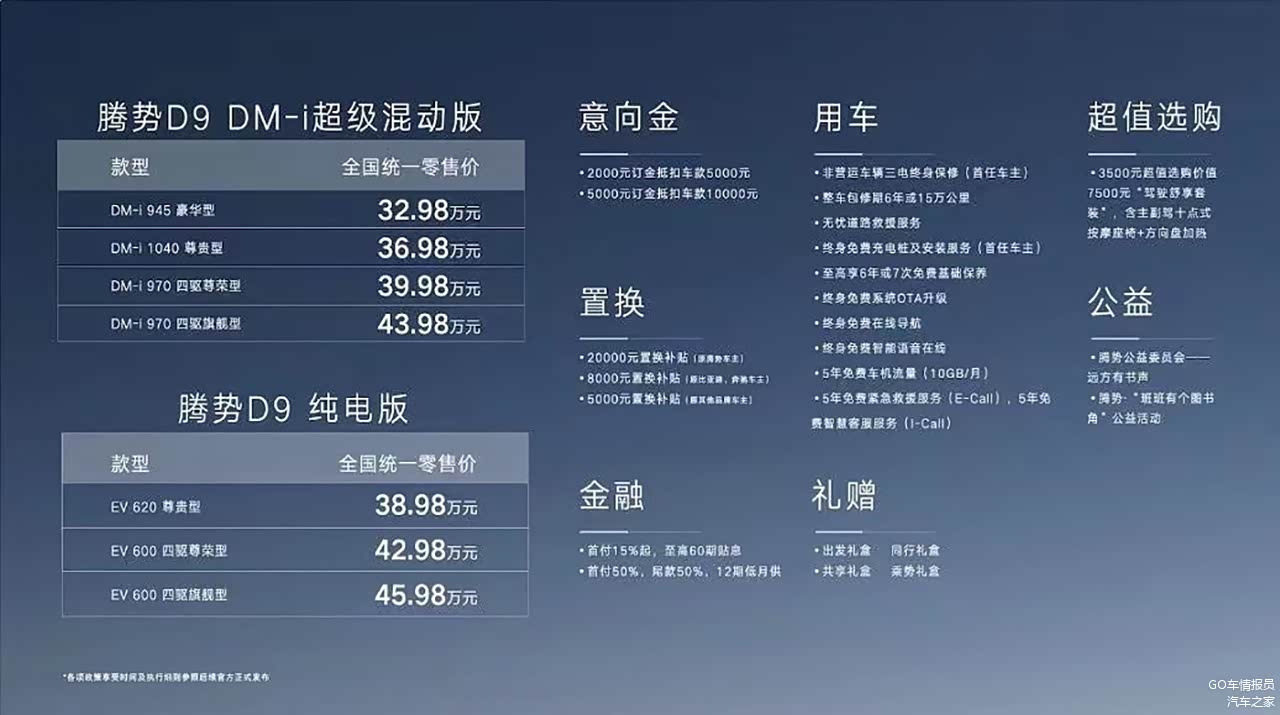 总结:整体下来,我认为腾势D9最值得购买的车型就是DM-i四驱970旗舰型以及EV 620尊贵型,这两款车型代表了不同的动力总成,也代表了不同的取向,对于需求不同的消费者都能满足,如果你想购买此款车型,不如参考一下。