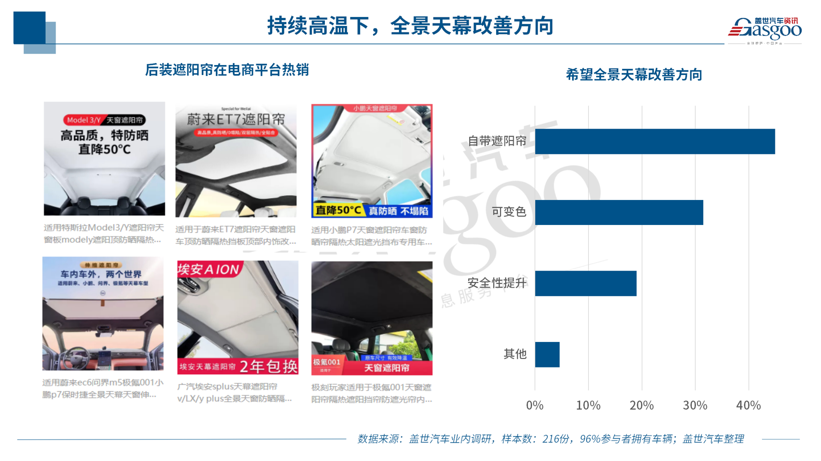 正如前文所说,取消遮阳帘源于新能源汽车,尤其是电动轿车垂直空间限制,需要通过释放电动天窗+遮阳帘结构空间从而带来更舒适的驾乘感受,但也让暴晒成为了上述调研中近九成参与者的普遍槽点。
