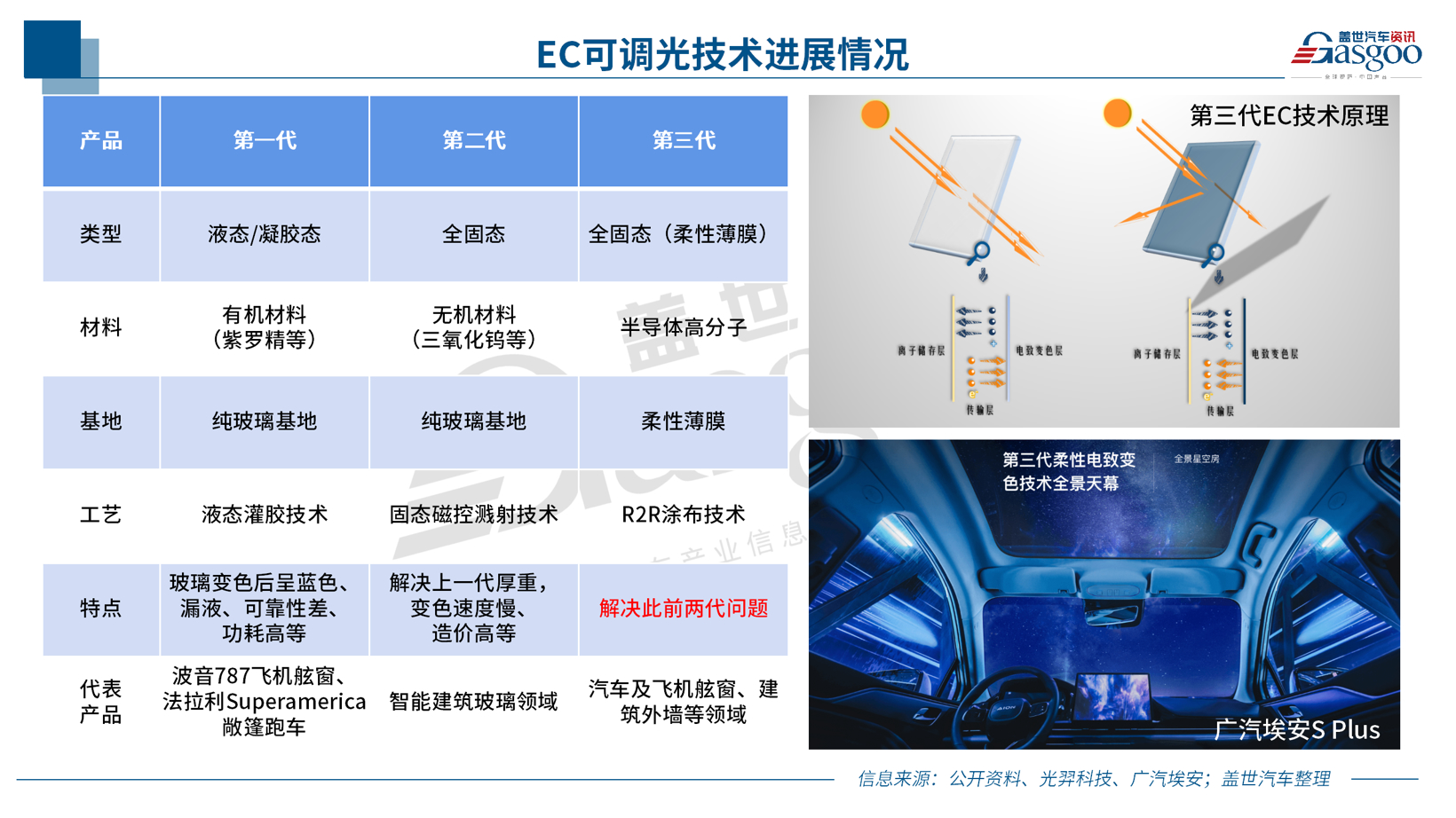 聚焦光羿科技本身,其自主研发的第三代柔性固态电致变色技术,相较于前两代电致变色技术路线,具有低雾度、定制化、轻量化、低电压、高曲率等显著功能优势。而其联合福耀集团为比亚迪海豹提供的多功能EC光感天幕,是现阶段尺寸最大的EC光感天幕,可针对光线自动控制汽车玻璃,使其光学和热学性能发生动态变化。