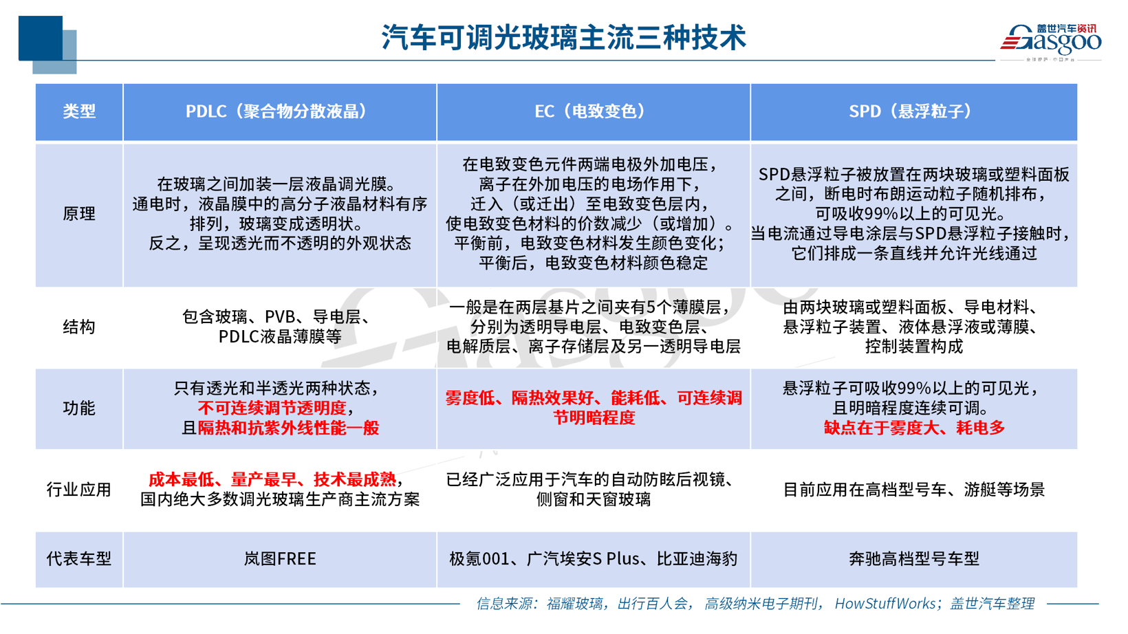 在此前的文章中我们曾简单介绍过现阶段汽车领域常规的三种调光玻璃方案,即PDLC(聚合物分散液晶)、EC(电致变色)及 SPD(悬浮粒子)。三者均属于电控型调光玻璃,但原理和效果存在差异。