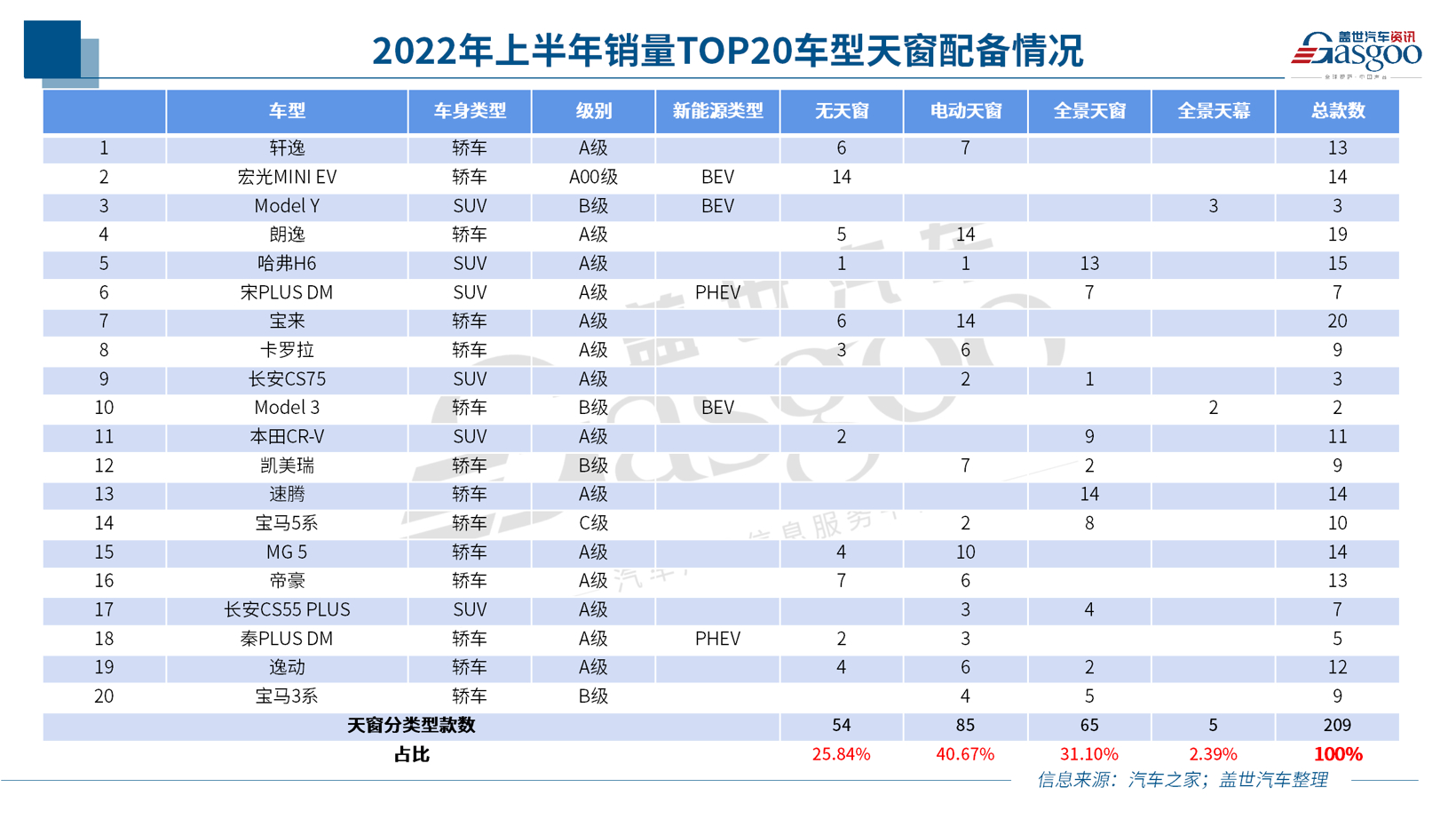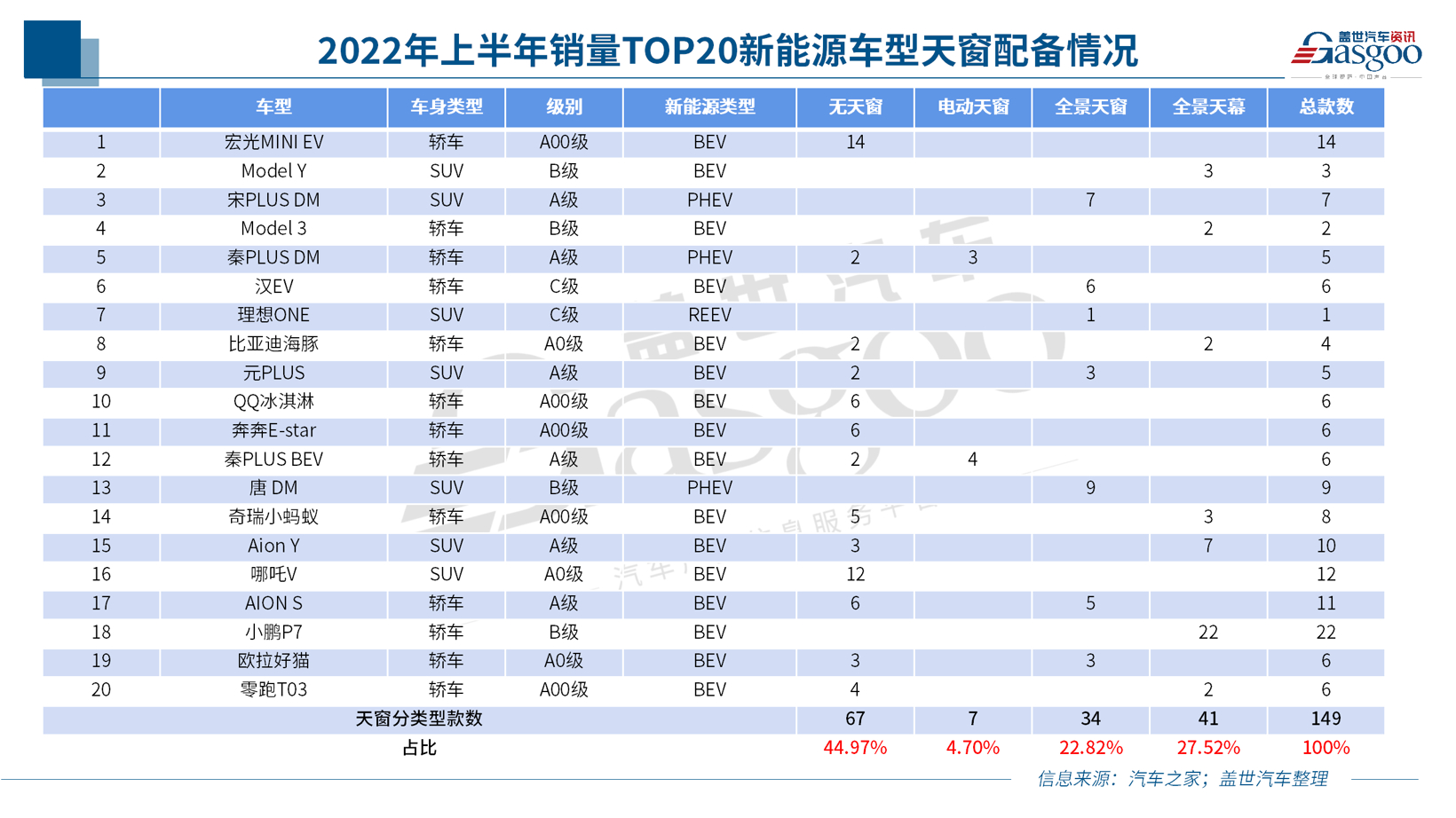 据盖世汽车针对2022年上半年销量TOP20的车型(累计销量241.8万辆,占比23.8%)的细分款型进行分析,无天窗的款型占比为27%,电动天窗的款型占比为 42.5%,全景天窗的款型占比为 32.5%,全景天幕的款型占比为2.5%。(此处是款型占比数,不等同于渗透率。以下同适用)