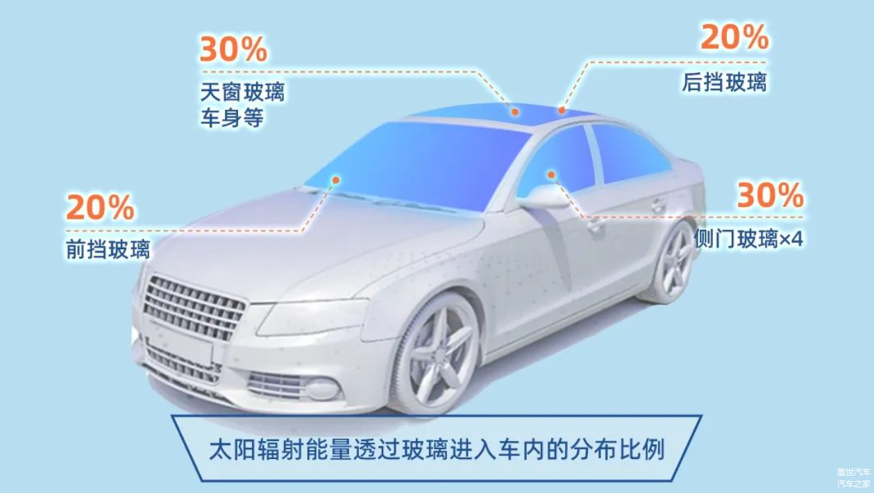 据他介绍,实际上太阳光通过玻璃进入车内,会分为几部分,第一部分会被玻璃表面反射出去,第二部分会由玻璃本体吸收,从而造成玻璃本体温度上升;剩余的便会随着可见光直接进入车内,带来刺眼、灼热等不良体验。