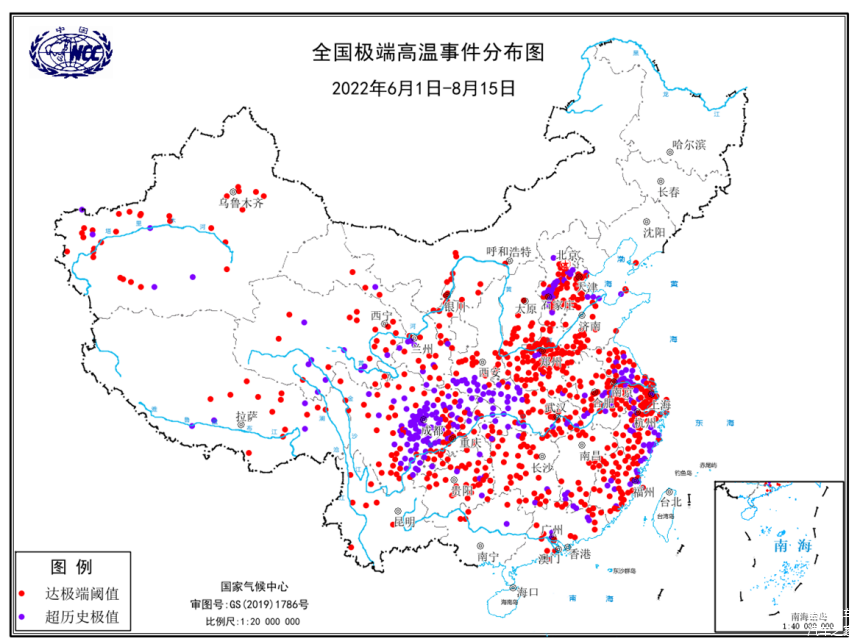 全国极端高温事件分布图(6月1日-8月15日);图片来源:国家气候中心