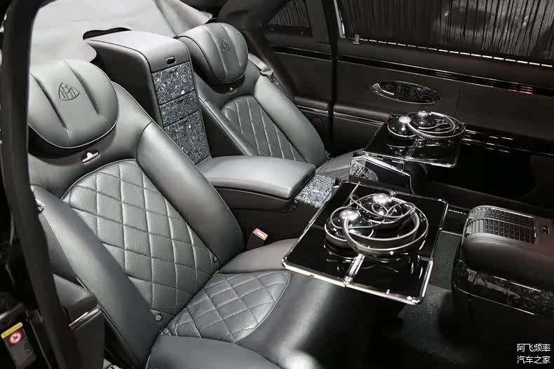 内饰依旧选择的是少见的黑色真皮内饰,座椅上配有菱形格缝线,值得注意的是,这款车并没有很多迈巴赫62S上常见的碳纤维装饰,而是选配了花岗岩材质,这一点同样较为罕见!