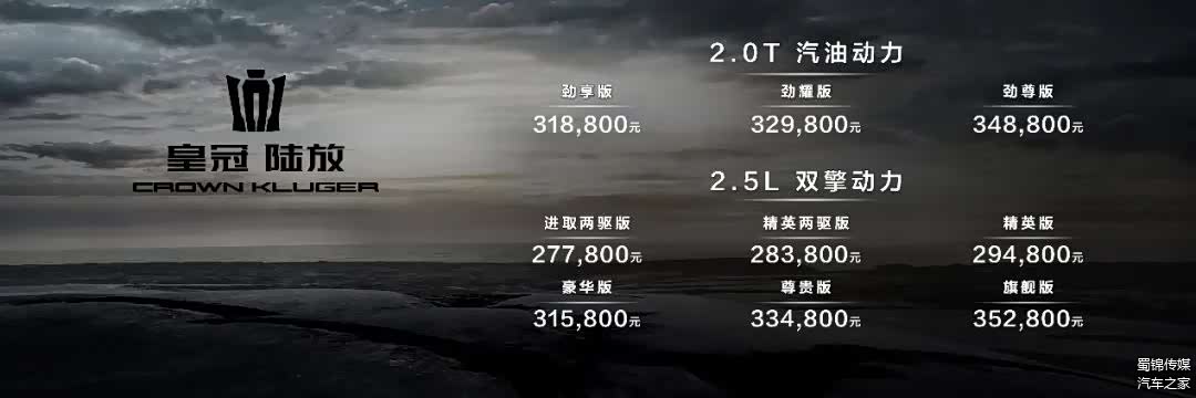 面对部分消费者这样的认知,丰田并没有一意孤行地去教育消费者,我的混动技术有多么好,而是顺应消费者需求,给主销车型提供不同的动力版本。近日,全系混动的一汽丰田皇冠陆放也在成都车展推出了2.0T纯燃油版的车型,三款车型的售价区间为31.48万-34.48万元。