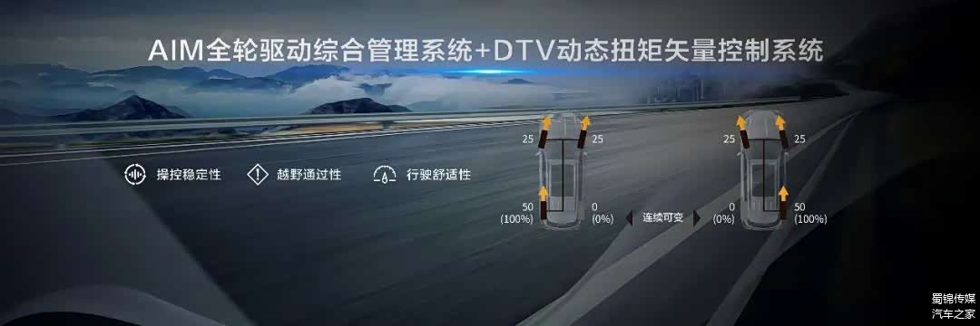 而2.0T燃油版车型则搭载的是DTV四驱系统,并带有AIM四驱综合管理系统。简单来说,这套四驱系统可以实现前后100:0-50:50的扭矩分配比,还能独立控制左右后轮实现100:0-0:100的扭矩分配。即便只有一个后轮拥有附着力,车辆依然能够依靠强大的四驱系统进行脱困,这样的表现在城市SUV中还是比较突出。