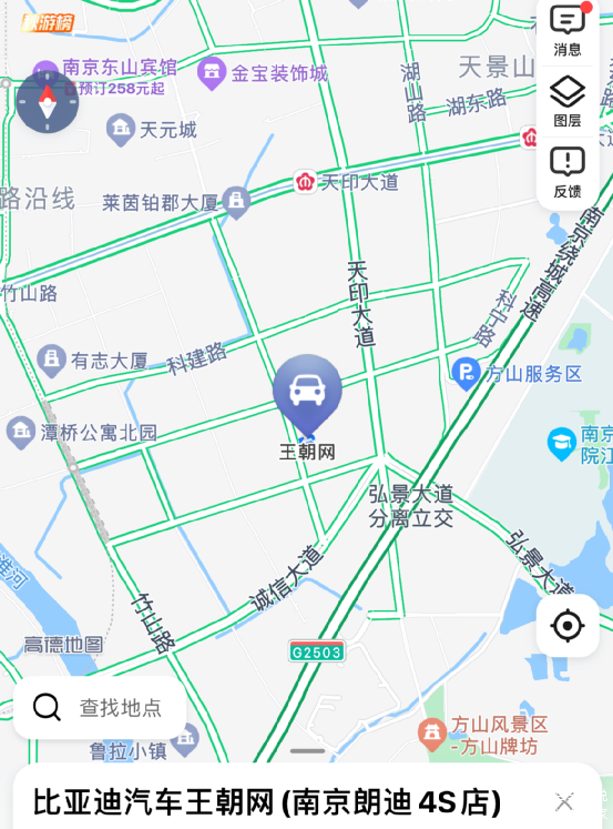 本次探店的4S店名称为江苏朗迪4S店,专门销售比亚迪的王朝系列。该店位于南京市江宁区彤天路101号。