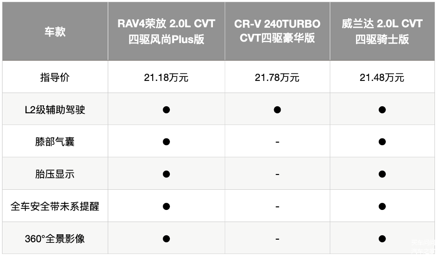 从三个车款的对比可以看出,RAV4荣放/威兰达和CR-V在当前消费者重视的主动安全和辅助驾驶部分都很给力,前两者配备了Toyota Safety Sense智行安全系统,后者则装备了Honda SENSING系统,均包含全速自适应巡航、主动刹车/前方碰撞预警、车道保持/车道偏离预警等功能,达到标准的L2级辅助驾驶能力。