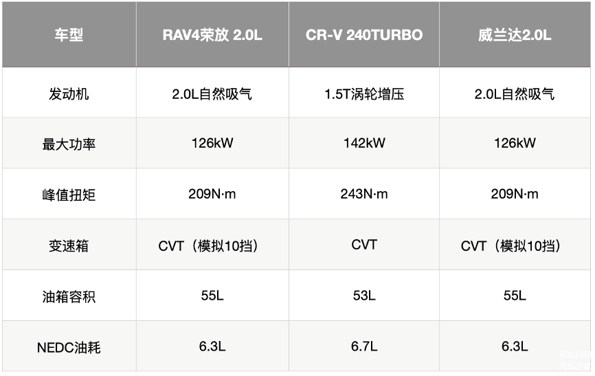 和RAV4荣放出自同门的威兰达形象上更精致、城市化一些,硬件水准和机械素质也与RAV4荣放相差无几,只是它作为本土特供车型,刨除产品本身的吸引力,威兰达在市场口碑、后期保值率等附加值方面明显不如RAV4荣放这样的“城市SUV鼻祖”;本田CR-V一直都是该级别“买了不会出错”的选项,只是拉长时间线来看的话,这一代CR-V已经发布了5年之久,如今进入了车型生命周期末期,在核心的机械素质方面无法像RAV4荣放/威兰达一样给到用户进一步的拥车体验,因此就现阶段的购买价值而言,CR-V是不如丰田两个对手的,不如耐心期待新一代产品的推出。