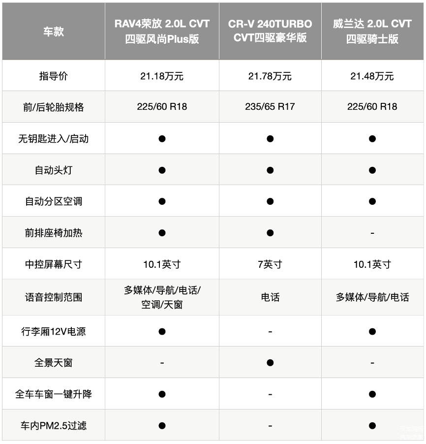 而在一些行走系和便利性配置层面,三款车型之间也出现了不少差异:RAV4荣放与威兰达提供更大的轮圈尺寸、更大的车内中控屏以及实用的全车车窗一键升降功能,RAV4荣放甚至提供了三款车型中最广的车内语音控制范围,这种立足本土消费者需求而设置的人车交互细节,在体验感方面是另外两款车型都无法提供的。而CR-V依靠全景天窗这样的讨喜配置搬回一城,并且和RAV4荣放一样,CR-V也提供了北方地区买家重视的前排座椅加热功能,其实综合来看的话,三款车型在便利性部分各有所长,而RAV4荣放在价格更低的前提下,配置表现却最为全面,值得注重性价比的消费者重点关注。