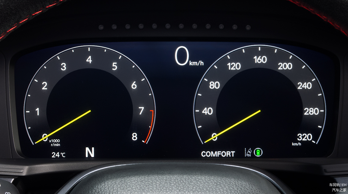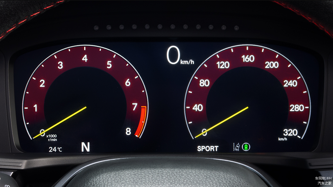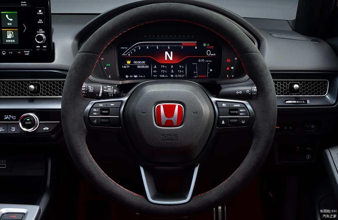 方向盘采用了alcantara翻毛皮材质包覆,辅以红色缝线。左右两边则是按键式的多功能控制,中间则是醒目的红标本田徽章。