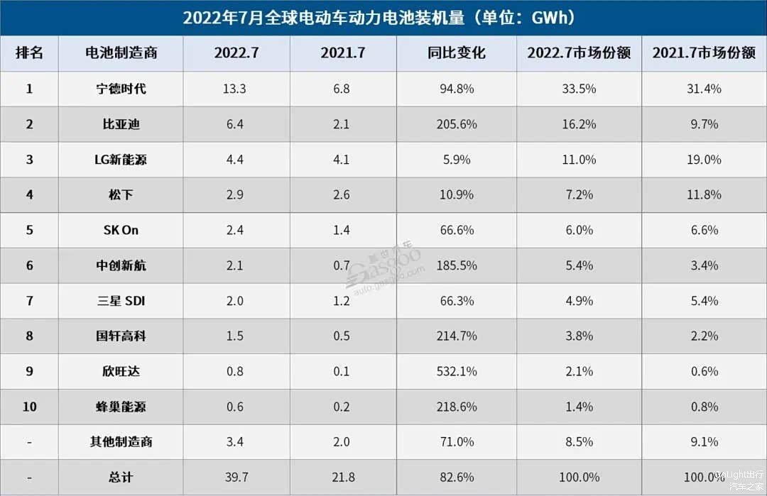 总体来看,7月份全球动力电池装机总量为39.7GWh,其中宁德时代独占三分之一,装机量达到13.3GWh;比亚迪装机量为6.4GWh,比第三名LG新能源高出一截,后者装机量为4.4GWh,与去年相比,LG新能源的市场份额下滑了8个百分点。