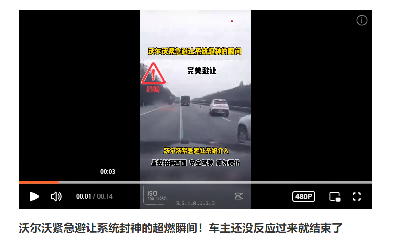 而这一切都被车上的记录仪完整纪录下来了,车主后来将这个经历发到了网上,并且配文:沃尔沃紧急避让系统封神瞬间!还没反应过来就结束了。