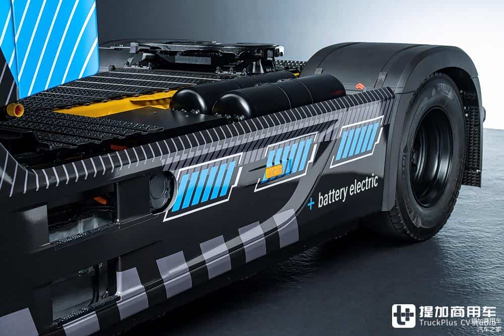 在底盘侧面的侧裙上,奔驰设计了独特的涂装,Battery electric字样代表本车是一台电池电动卡车(BEV)。侧裙内部安装了车辆的高压电池、低压电池以及刹车储气罐。此外,应该还有空气压缩机之类的设备。奔驰称:车载电池采用LFP磷酸铁锂电池,三组电池组共能带来超过600千瓦时的电能储备。来自奔驰的数据显示,这款车的单车续航里程,在500公里左右。