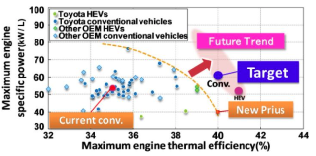 通过VVT-iE技术控制进气阀晚关灵活进入阿特金森循环,这一技术早先用在雷克萨斯LS600h的发动机上;其次采用了电子水泵、电子节温器、可变流量机油泵、 大流量的冷却废气再循环Cooled EGR系统等设计,让燃烧完的废气再次进入气缸,借助汽缸盖那里的冷却水对废气降温,然后再经过电子控制EGR阀门注入进气管。因为废气中已经没有了氧气,所以和正常空气混合后就稀释了氧浓度,但进气量没有减少,即保证了足够膨胀压力,在发动机中等转速的时候可以降低油耗。